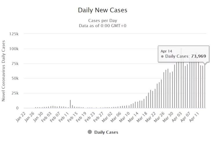 Количество новых инфицированных уже несколько дней держится приблизительно на одном уровне. За день выявлено 73 969 инфицированных (13 апреля было 71 571, 12 апреля — 72 523).