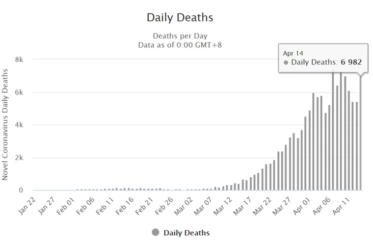 Зато количество умерших вчера резко подскочило. За день умерли 6 982 человека (13 апреля было 5 412, 12 апреля — 5 417, 11 апреля — 6 092).