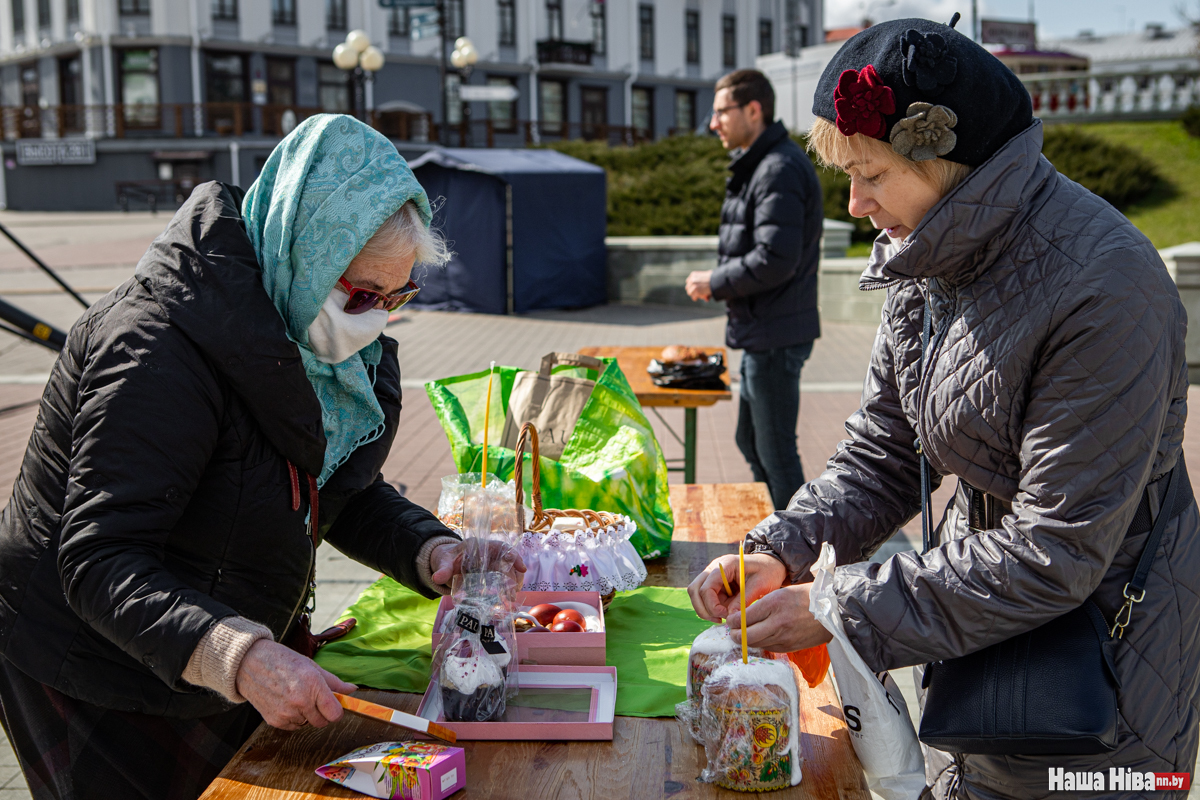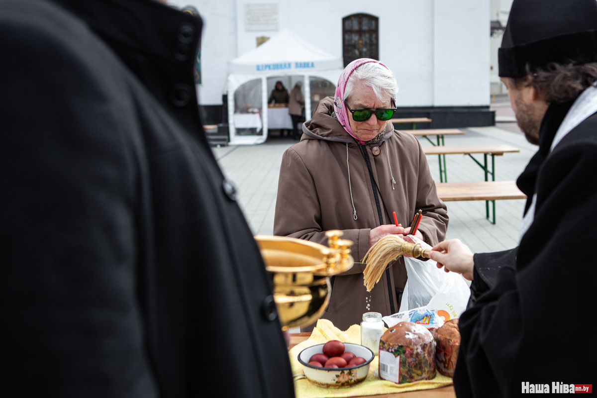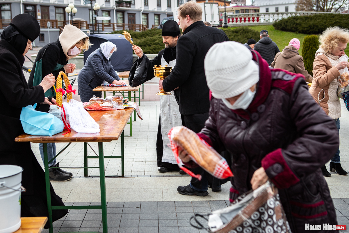 Однако некоторые верующие пришли освятить пасхальную пищу возле минских храмов. Людей действительно меньше, чем в другие годы, многие стараются придерживаться дистанции, в храмах висят листки с советом о дистанции.