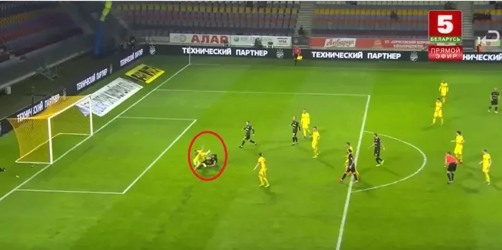 Игрок «Шахтера» Юлиус Сёке пошел в стык с вратарем БАТЭ Игорем Чичканом, выставив вперед обе ноги. Он врезался в соперника, однако заодно пропихнул мяч вперед. И его партнер Дмитрий Подстрелов забил в пустые ворота. Можно ли было засчитывать гол? Большинство экспертов полагают, что судье следовало прекращать игру из-за нарушения правил.