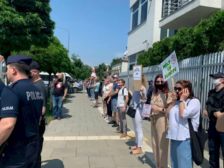 В заранее согласованной акции солидарности 21 июня у белорусского посольства в Варшаве приняли участие не только белорусы, но и поляки, и украинцы.