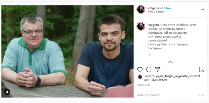 На своей странице в инстаграме Ольга написала: «Чего стоит свобода, если любая, не совпадающая с официальной точка зрения считается диверсией и провокацией. Свободу Виктору и Эдуарду Бабарико».