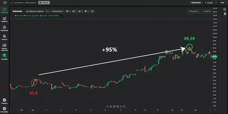 Третье место за очередной американской фармацевтической компанией Novavax, чьи акции подорожали в июне на 95%, с $45,8 до $89,39.