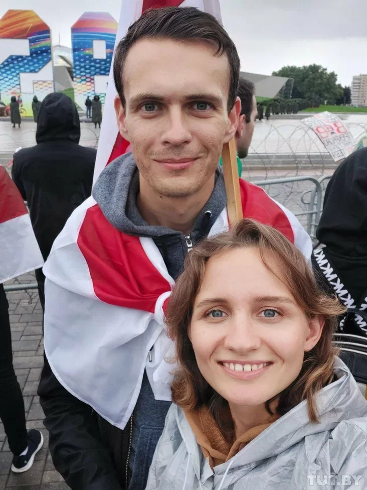 На фото — Александр Поплавский и его девушка. Парню 26 лет, говорит, что участвовал в сегодняшнем шествии. Пришли к барьеру, который неподалеку от Дворца независимости выстроили силовики, «постояли там минут 40».