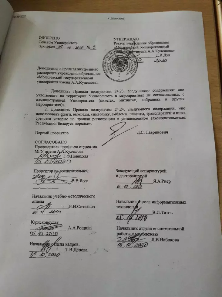 Сегодня были внесены дополнения в правила внутреннего распорядка могилевского государственного университета им. Кулешова, сообщает mogilev.online.