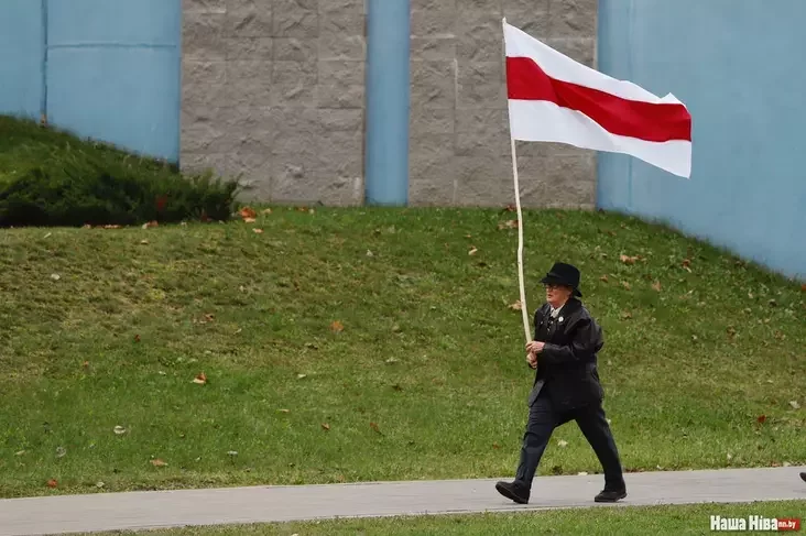 К женщинам присоединилась легендарная Нина Багинская с национальным белорусским флагом.