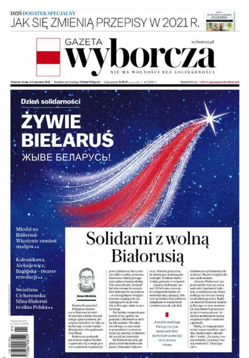 Первая независимая ежедневная газета посткоммунистической Польши и одно из самых популярных изданий в стране, Gazeta Wyborcza посвятила сегодняшнюю передовицу событиям в Беларуси.