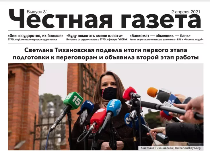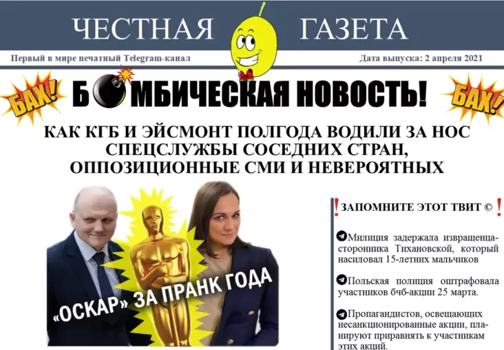 2 апреля вышел уже 31-й номер «Честной газеты» — и тут-то, по традиции с опозданием, проснулась пропаганда. Провластный сливной телеграм-канал, который восхваляет жесткость силовиков и популяризирует передачи пропагандистов вроде Григория Азарёнка и Юлии Артюх, начал выпускать свой вариант «честной» прессы.