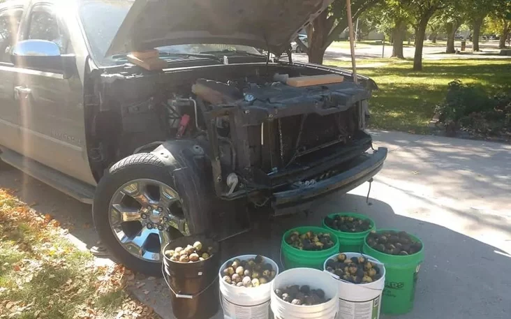 Чтобы достать грецкие орехи из всех отверстий, мужчине пришлось снять крылья автомобиля. Но Фишер продолжает находить «заначки». «Есть места, куда мне не добраться», — объяснил он. Владельцу авто пришлось потратить пару дней, чтобы вычистить свой Chevrolet Avalanche.