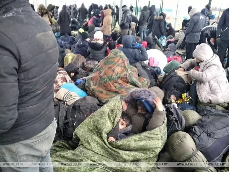 Мигранты на польско-белорусской границе ставят палатки, раскладывают спальники прямо на дороге и разводят костры. Они разбивают лагерь у пункта пропуска на въезде в Польшу. Фото публикуют государственные СМИ.