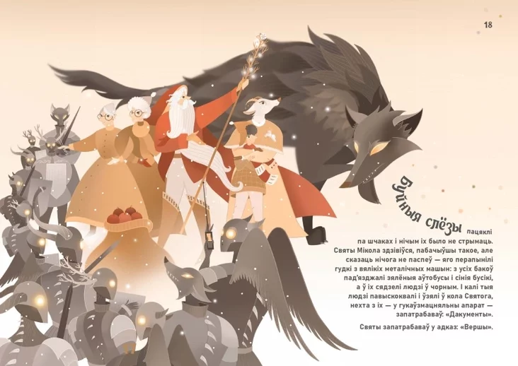Я думаю, што ў гэтым плане Ліза шмат чаго дадала. Напрыклад, яна вырашыла не маляваць балаклавы і такім чынам не помсціць, бо яны самі сабе адпомсцілі. І яна знайшла спосаб паказаць гэтыя чорныя сілы ў фантастычным вобразе галоднага ваўка — зло заўжды галоднае. І з іншага боку — людзей, светлых і ўтульных. Яны, канешне, крыху напалоханыя, але з імі застаюцца гісторыі, якія яны пераказваюць адно аднаму на Каляды, спевы, нейкія інтуітыўныя рашэнні дзяцей. Гэта ўсё — наш культурны код, які проста так не расцярушыш, але ім трэба апекавацца, яго трэба прамаўляць, паказваць. Па пунктах не раскажаш, што гэта — ён праяўляецца ў паводзінах і рэакцыях. Нават калі людзі знялі абутак, каб стаць на лаўку, — гэта так па-беларуску!