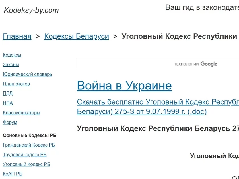 На сайте kodeksy-by.com, где публикуют все законы и кодексы Беларуси, при открытии любых страниц появляется гиперссылка под названием «Война в Украине», заметила «Медиазона».
