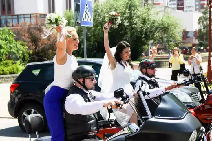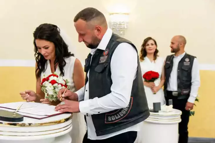 Необычная свадебная процессия — колонна байкеров из трех десятков мотоциклов — привлекала внимание горожан. Да и в зале, где регистрируют брак, было не совсем типично.
