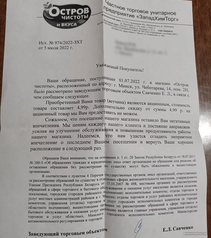 Минчанин борется за обещанную скидку, а магазин не хочет отдавать ветчину дешевле