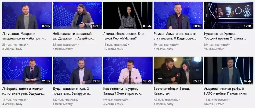 На канале, среди прочих, были такие видео как «Лягушонок Макрон и американская лягушка против белорусской конституции», «Дудь — вшивая гнида», «Антом Мотолько. Дегенерат, гопник и мразь».