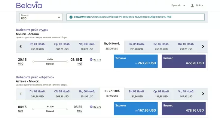 Астана на длинные выходные тоже довольно дешевая — 263 за билет туда и 168 назад. Лететь можно почти в любой день, цены отличаются не критично.