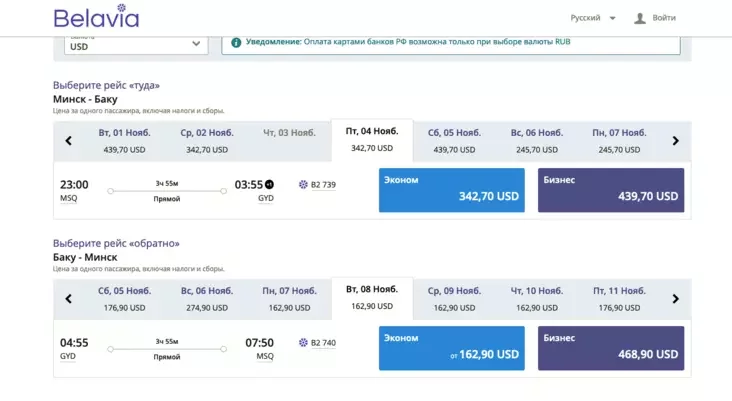 Билеты в Баку в «Белавиа» на удивление (и относительно) дешевые. Если улететь вечерним рейсом в пятницу 4 ноября, нужно будет заплатить почти 343 доллара — конечно, багаж не включен. Вернуться в Минск можно за 163 доллара — такая цена почти на все дни, но неплохим выглядит утренний рейс 8 ноября.