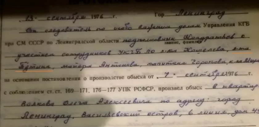 На протокол обыска, который выставлен в Музее политической истории в Санкт-Петербурге, обратил внимание историк Константин Шолмов. В документе Путин значится как «лейтенант КГБ», никаких других сведений не приводится. Если ориентироваться на официальную биографию президента России, то в день обыска, 13 сентября 1976 года, ему было 23 года, он уже прошел курсы подготовки оперативного состава КГБ и действительно был аттестован как «старший лейтенант юстиции территориальных органов» советской спецслужбы.