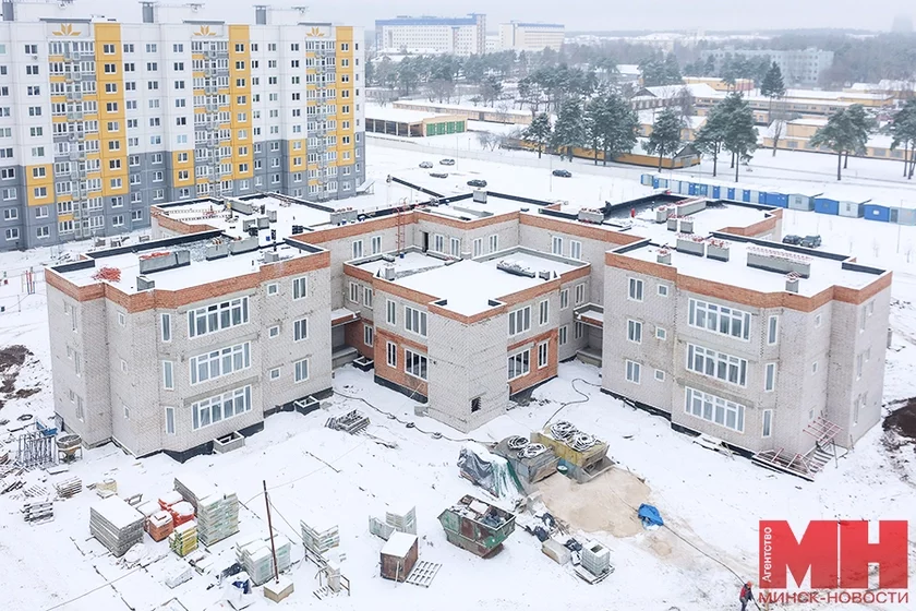 — Сейчас на объекте задействованы 70 человек c нашего предприятия, — рассказывает представитель генподрядчика, начальник участка СУ № 94 «Стройтреста № 1» Владимир Волчок. — У каждого из шести его подразделений свой фронт работ: отделка, электрика, вентиляция и сантехника, кровля, наружные сети и благоустройство. В самом начале лета приступили к разработке котлована, через две недели — к забивке свай, а позже, с 20 июля, — и к монолитным работам на фундаменте цокольного этажа. Это очень трудоемкий процесс. После перекрытия подвала занялись кирпичной кладкой первого и последующих этажей. Режим работы у нас обычный и вахтовый — по 12 часов. Срок сдачи объекта под ключ — апрель 2023 года. Однако благоустройство территории и окраска фасада в целях экономии средств состоится позже, в более благоприятный температурный период.