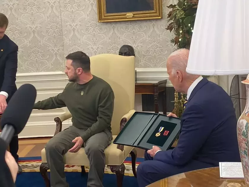 Подарком, который привез Зеленский, была медаль от украинского оператора батареи HIMARS по имени Павло. По словам Зеленского, военный очень просил его передать Байдену эту награду вместе с личным письмом.