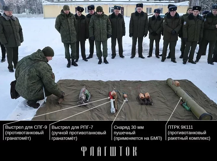 Среди продемонстрированных взрывоопасных предметов противотанковый ракетный комплекс «Фагот», выстрелы для противотанковых гранатометов (СПГ-9 «Копье» и РПГ-7) и 30-миллиметровый пушечный снаряд для БМП. Все эти вооружения применяются российской армией и сегодня, включая территорию Украины.