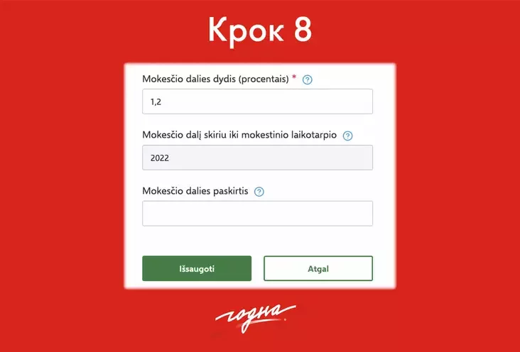 Далее прописываем, какой процент от нашего налога мы отдаем этой организации. Если это НГО — 1,2%. Последнюю строчку заполнять необязательно. Но при желании тут можно отметить, на что именно вы бы хотели, чтобы пошёл ваш взнос. Затем нажимаем Išsaugoti (сохранить).