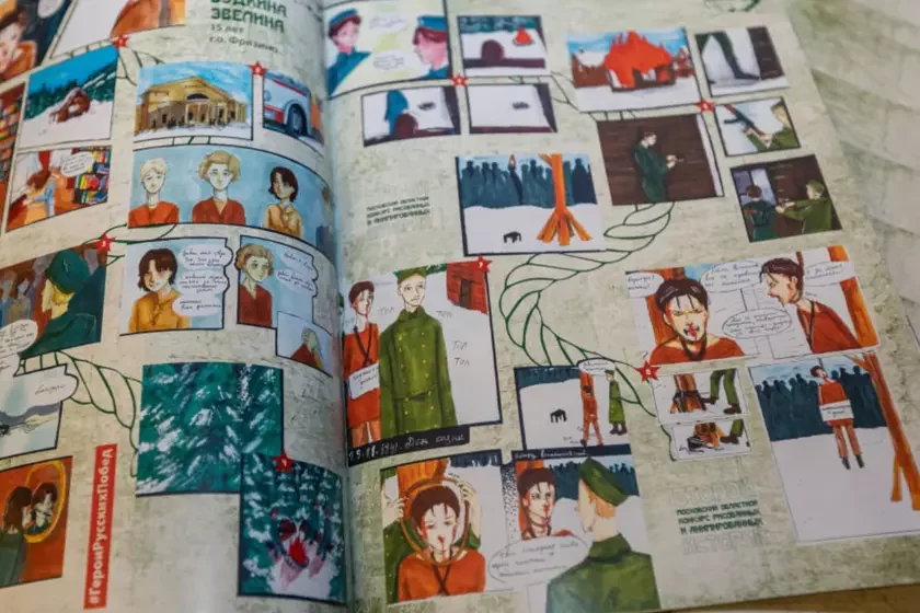 На кадрах, опубликованных в соцсетях фонда, есть финал комикса о Зое Космодемьянской. Комикс, изображенный 15-летней девочкой, заканчивается казнью через повешение.
