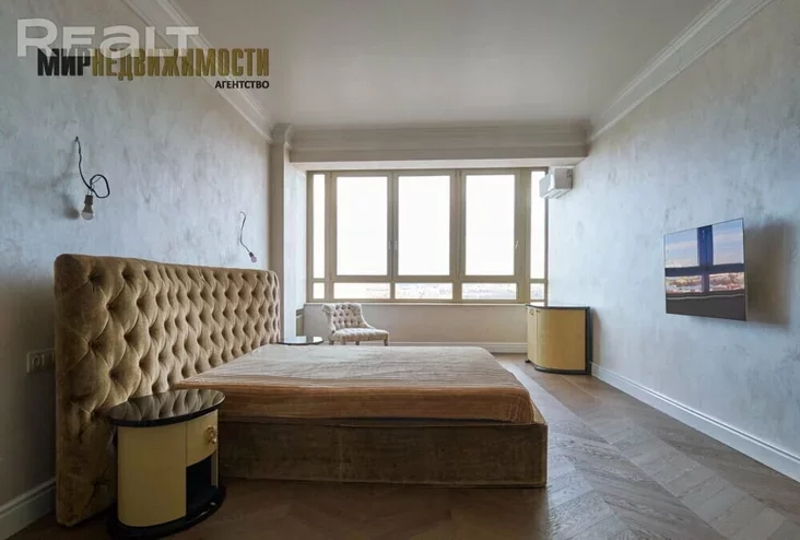 Общая площадь квартиры составляет 274 м кв., жилая — 211. Высота потолков — 3 метра. В квартире три раздельные жилые комнаты, кухня-гостиная на 121 м кв., три санузла, две гардеробные. Окна выходят на две стороны дома. Открывается вид на Свислочь и проспект Победителей. Мебель и предметы интерьера — Roberto Cavalli, привезены из Италии.