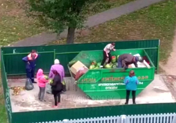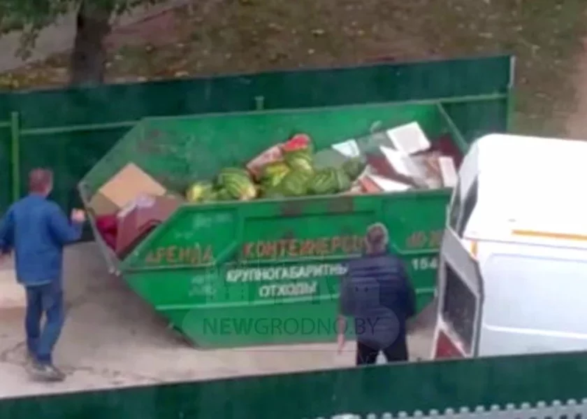 К мусорной площадке подъехал микроавтобус, из него вышли двое мужчин и стали выгружать в контейнер десятки арбузов. Вероятно, это были непроданные или испорченные излишки товаров, пишет newgrodno.by.
