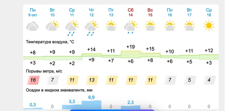 У чацвер, 12 кастрычніка, на большай частцы тэрыторыі краіны пройдуць кароткачасовыя дажджы. Вецер часам моцны парывісты. Ноччу ад +6°С па паўночным усходзе да +14°С па захадзе краіны, максімальная днём +12..+19°С.