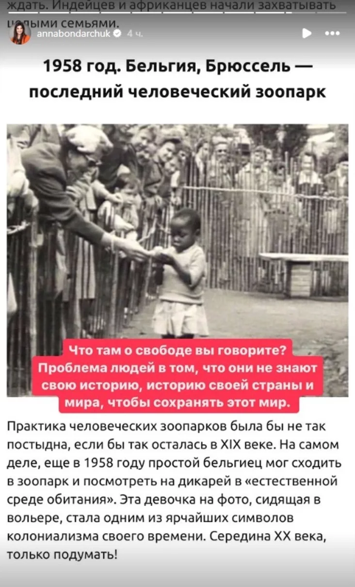 В другом посте Анна опубликовала скрин статьи о человеческом зоопарке в Бельгии в 1958 году и спросила у подписчиков, о какой свободе в Европе они ей рассказывают.