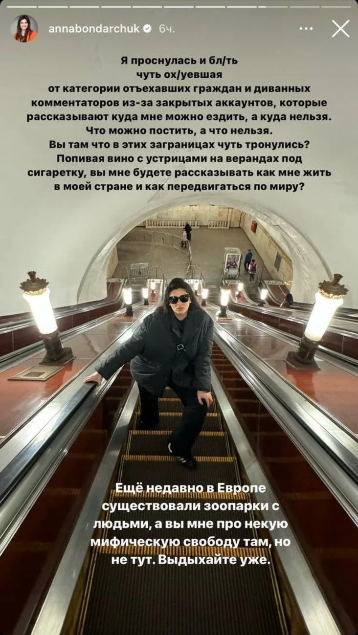 «Я проснулась и бл*** чуть ох****ая от категории отъехавших граждан и диванных комментаторов из-за закрытых аккаунтов, которые рассказывают, куда мне можно ездить, а куда нельзя. Что можно постить, а что нельзя. Вы там что, в этих заграницах чуть тронулись? Попивая вино с устрицами на верандах под сигаретку, вы мне будете рассказывать, как мне жить в моей стране и как передвигаться по миру?»