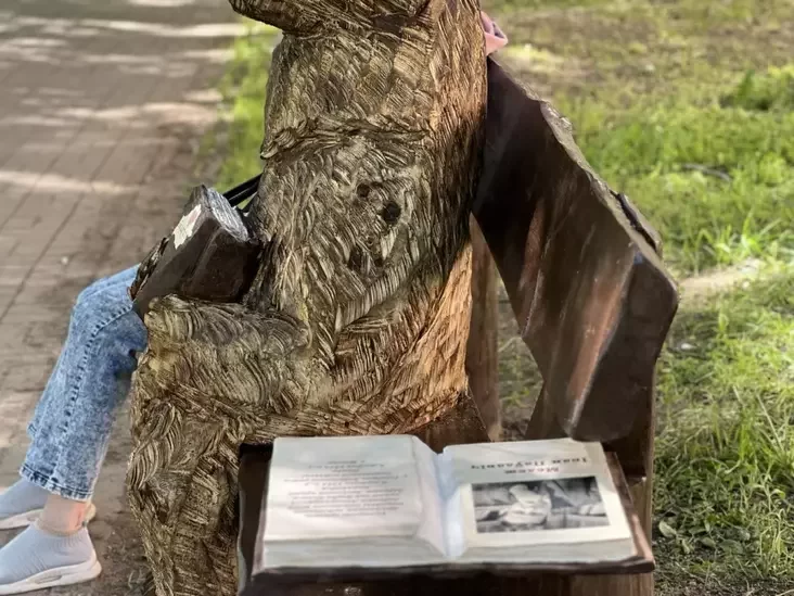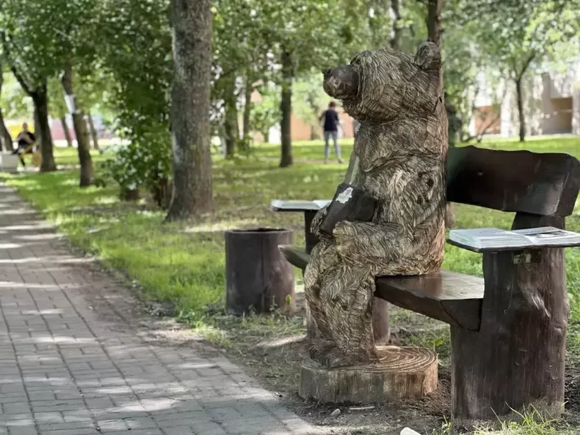 На одну из скамеек посадили деревянного медведя, а с двух сторон возле него разместили развернутые книги писателя, автора знаменитой «Полесской хроники» Ивана Мележа, в честь которого названа улица.