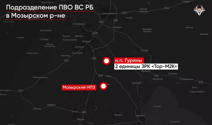 Часть ЗРК «Тор-М2К» прибыли в Мозырский район. По информации «Беларускага Гаюна», в окрестностях н.п. Гурыны (Мозырский район) были размещены по меньшей мере две боевые машины ЗРК «Тор-М2К». Расстояние от огневой позиции до Мозырского нефтеперерабатывающего завода (НПЗ) составляет около девяти километров.