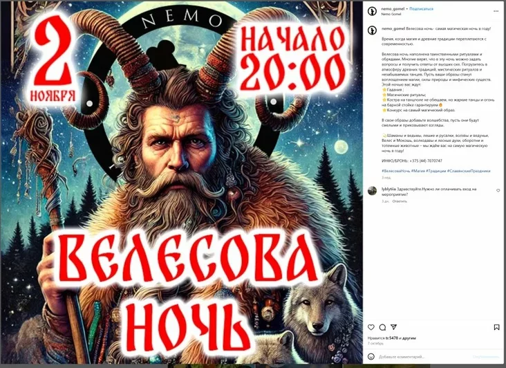 В условиях фактического запрета отмечать популярные западные праздники гомельские клубы заменяют их российскими. Вместо Хэллоуина они приглашают посетителей на «Велесову ночь», которая позиционируется как славянский аналог этого праздника, пишет «Флагшток».