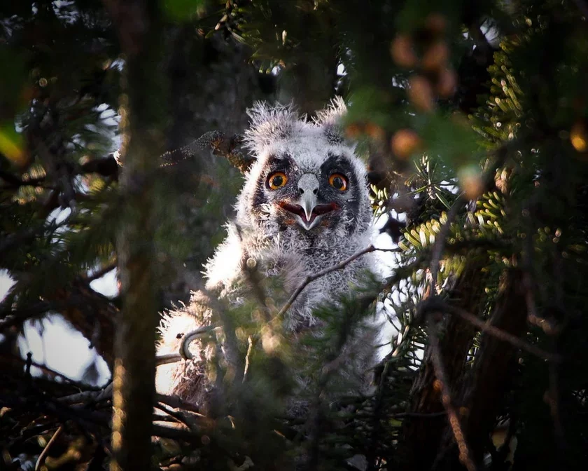 Птенец ушастой совы, вылупившийся в бывшем гнезде серой вороны в Бресте. Фото: Виталий Некрашевич