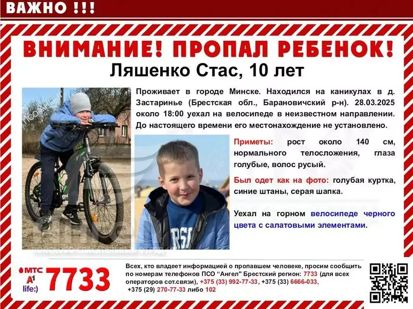 Стас Ляшенко живет в Минске, но на каникулах находился в деревне Застаринье Барановичского района. 28 марта около 18:00 он поехал на велосипеде в неизвестном направлении, и ребенка до сих пор не нашли, пишут волонтеры.