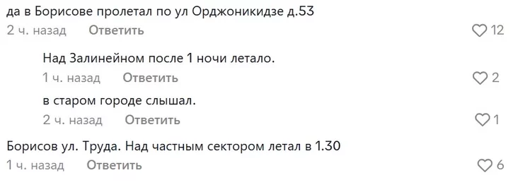 Свидетель пишет, что «звук мопеда» был слышен в Климовичском районе Могилевской области около 12 часов ночи. «Не факт, что летел один. Летел в сторону Костюкович».