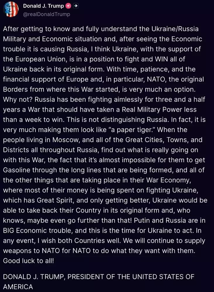 В любом случае, я желаю обеим странам всего наилучшего. Мы продолжим поставлять оружие в НАТО, чтобы НАТО делало с ним то, что считает нужным. Удачи всем!», — написал президент США.