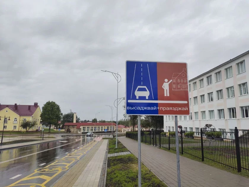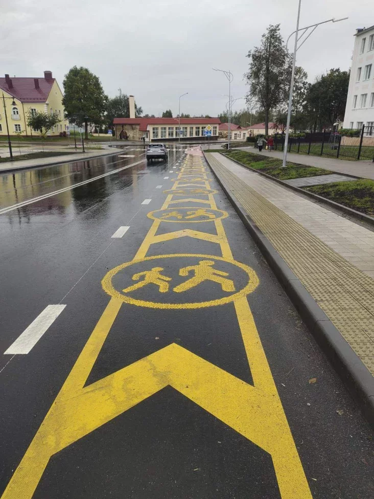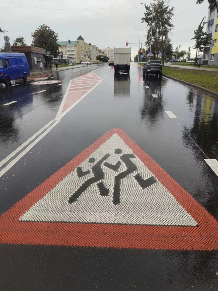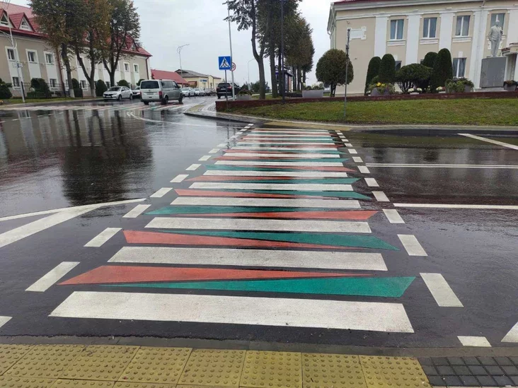 Традиционную белую «зебру» возле заславльской школы дополнили яркими элементами: жёлтая зона посадки-высадки детей с окантовкой из красного холодного пластика. Такой контрастный дизайн призван максимально привлечь внимание водителей, заставив их заранее снизить скорость.