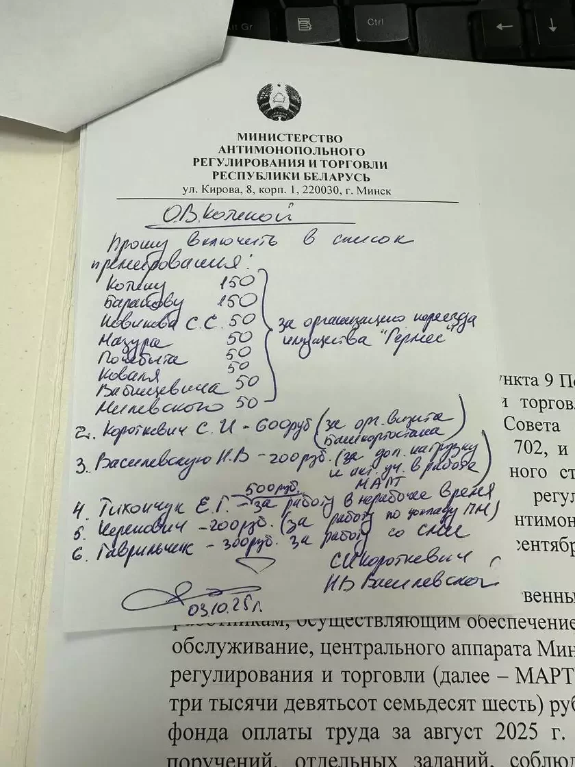 Сегодня в 15:39 в канале Министерства антимонопольного регулирования и торговли появилось и тут же было удалено сообщение с внутренним документом. На листке формата А6 указано, кому необходимо выплатить премии за сентябрь.