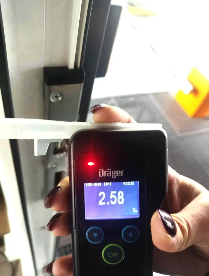 При проверке документов у пограничников возникли подозрения, что водитель нетрезв: от него сильно пахло спиртным, речь была несвязная, движения — нескоординированные. Алкотестер показал 2,58 промилле, что в Литве рассматривается как тяжелая степень опьянения и влечет за собой уголовную ответственность. Сам водитель признался, что пил накануне.