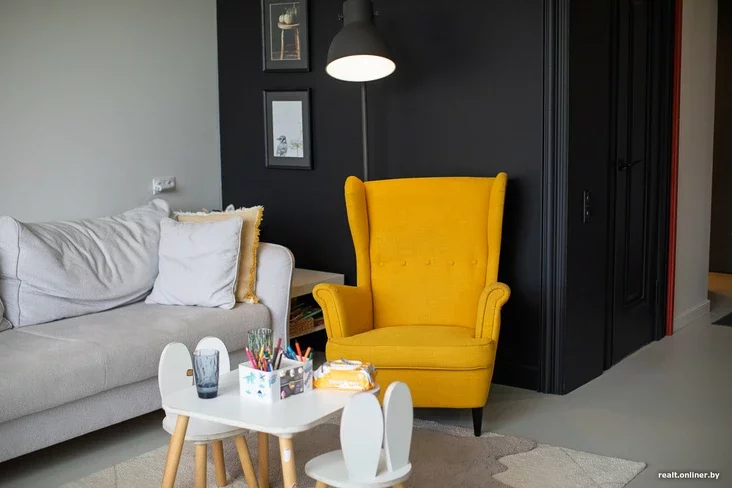 Второе наше удачное решение — покрасить стены в гостиной немецкой краской «Ремерс». Её легко отмыть от любого загрязнения, включая фломастеры. Всего на стены ушло 140 литров».