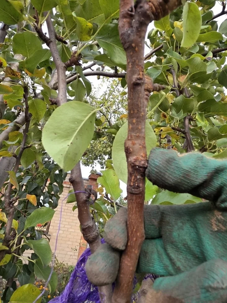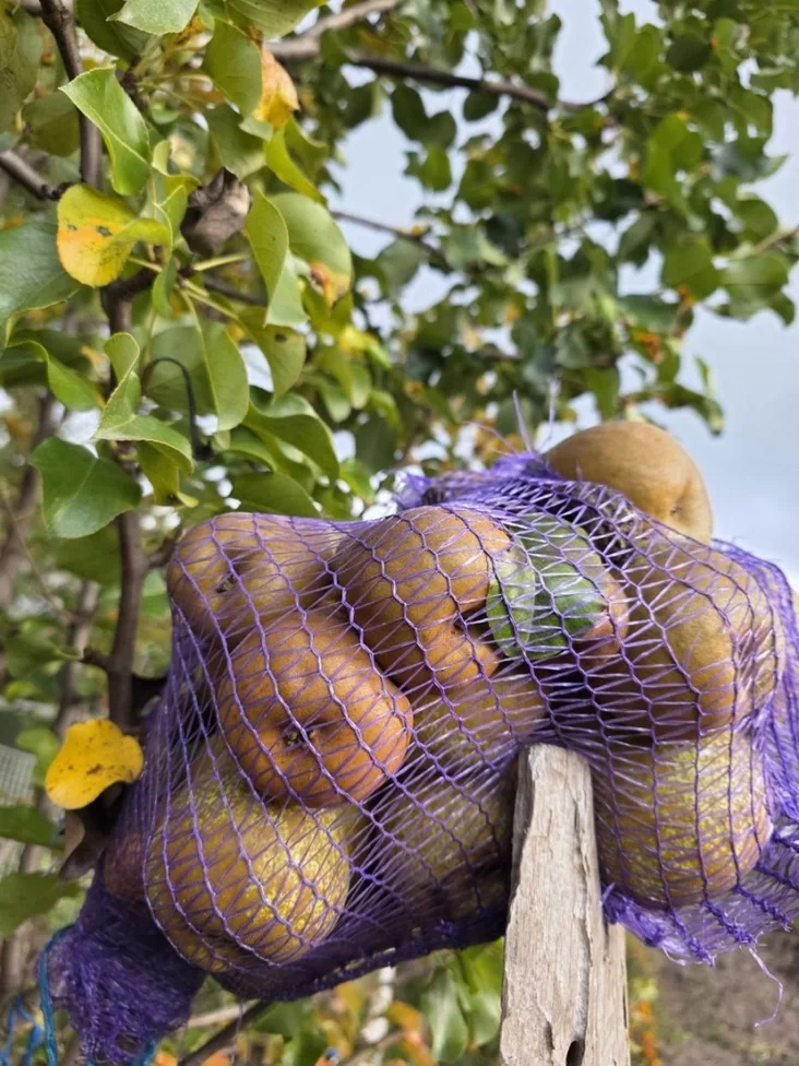 Половину завязей пришлось удалить, потому что столько плодов маленькая ветка не выдержала бы. А чтобы сохранить остальные груши, хозяин поместил их в сетку для равномерного созревания и подпер ветку, чтобы она не сломалась.