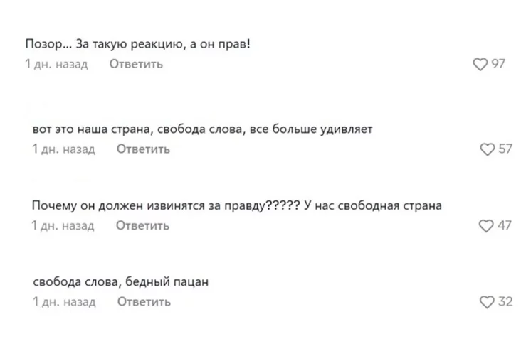 «Позор… За такую реакцию, а он прав!», «Вот это наша страна. Свобода слова. Всё больше удивляет», «Почему он должен извиняться за правду??? У нас свободная страна», «Свобода слова, бедный пацан».