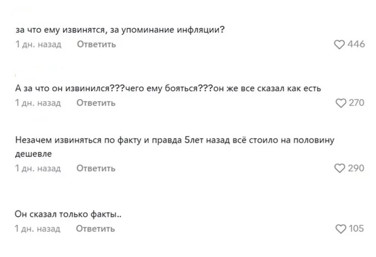 «За что ему извиняться, за упоминание инфляции?», «А за что он извинился? Чего ему бояться? Он же всё сказал как есть», «Не нужно извиняться по факту. И правда, пять лет назад всё стоило наполовину меньше», «Он сказал только факты».