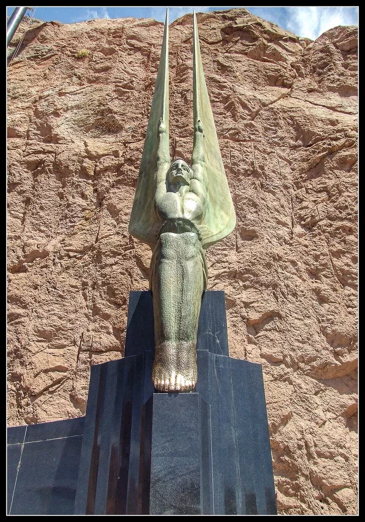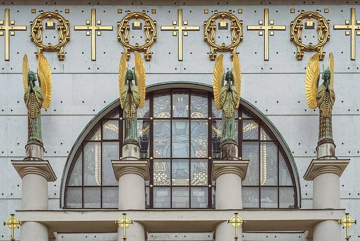 На карнизе также можно заметить странные объекты — может быть, это просто композиции с вазами и советскими флагами, но их силуэты больше всего напоминают упрощенный вариант излюбленного в ар-деко мотива крылатых людей, как тех, что украшают довоенную плотину Гувера в США — скорее, не ангелов-заступников, а Икаров, как символов стремления человечества к прогрессу, полету технической мысли и вере в могущество разума. Все это соответствовало и духу советского авангарда.