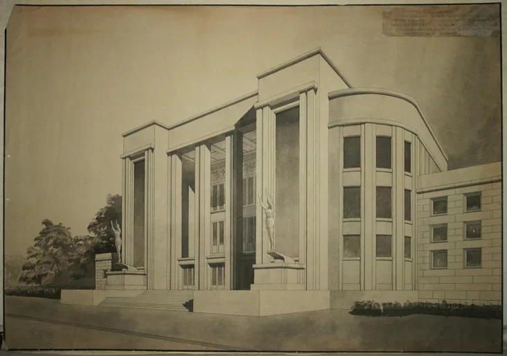 Еще одним нереализованным зданием, чья советская архитектура перекликается с буржуазным ар-деко, был проект здания бань с бассейнами, разработанный архитектором Мороговским в 1935 году. Его архитектура, как ранее отмечал автор канала, очень напоминает архитектуру Театра на Елисейских полях — первого в Париже здания в стиле ар-деко, построенного еще в 1910‑е годы по проекту братьев Огюста и Гюстава Перре.