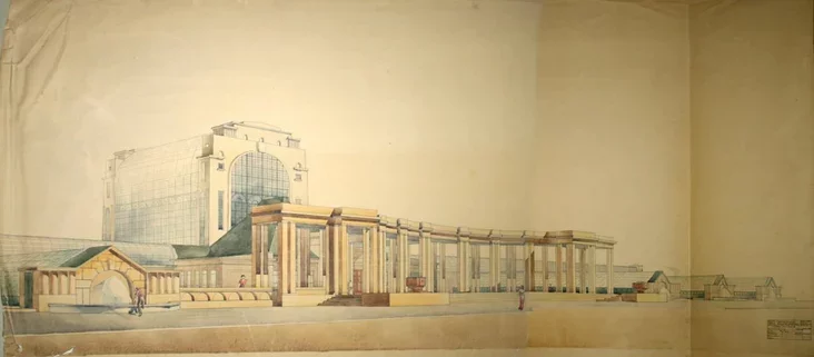 К этому же ряду относится и нереализованный проект оранжереи ботанического сада Академии наук, который выполнил архитектор Владимир Вараксин в 1936 году — с колоннадой на квадратных столбах и высоким ступенчатым объемом центральной оранжереи, застекленным цилиндрическим стеклянным сводом, и с большим полуциркульным окном в торце, подобным тем, которые можно увидеть на американских вокзалах 1930‑х годов.