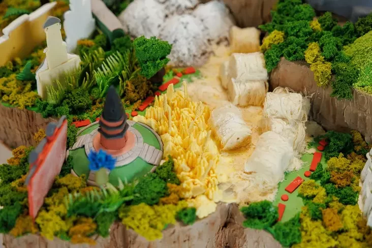 Декор торта выполнен вручную и воссоздает знаковые достопримечательности и символы каждого региона: от Национальной библиотеки и Брестской крепости до карьерных самосвалов, Беловежской пущи, аистов и зубров.